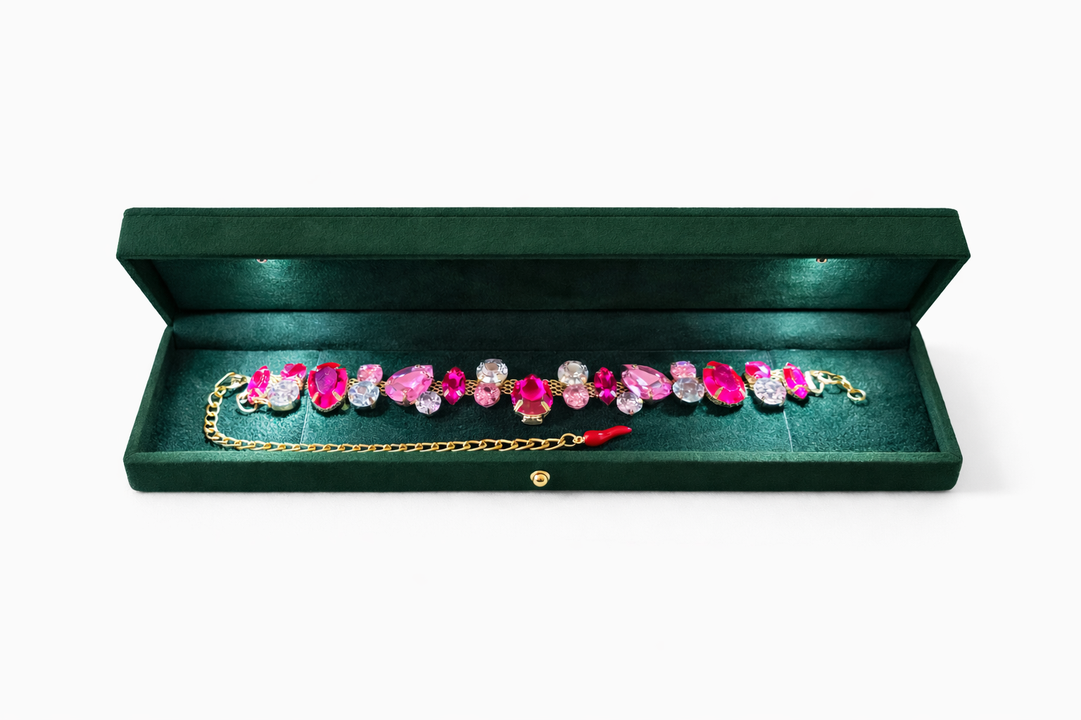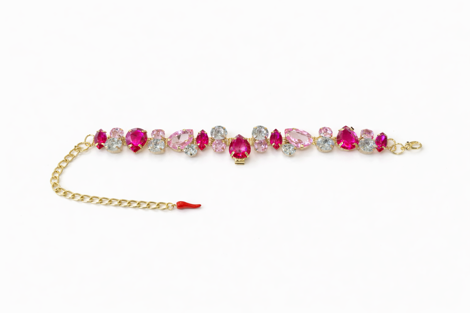 Bold, romantic, and unapologetically glamorous, The Maria is a statement piece designed to turn heads. Featuring a radiant arrangement of pink and ruby-toned crystals, this bracelet balances soft femininity with striking confidence. Each stone is carefully set in a gold-tone finish, forming a perfectly symmetrical silhouette that catches the light from every angle.