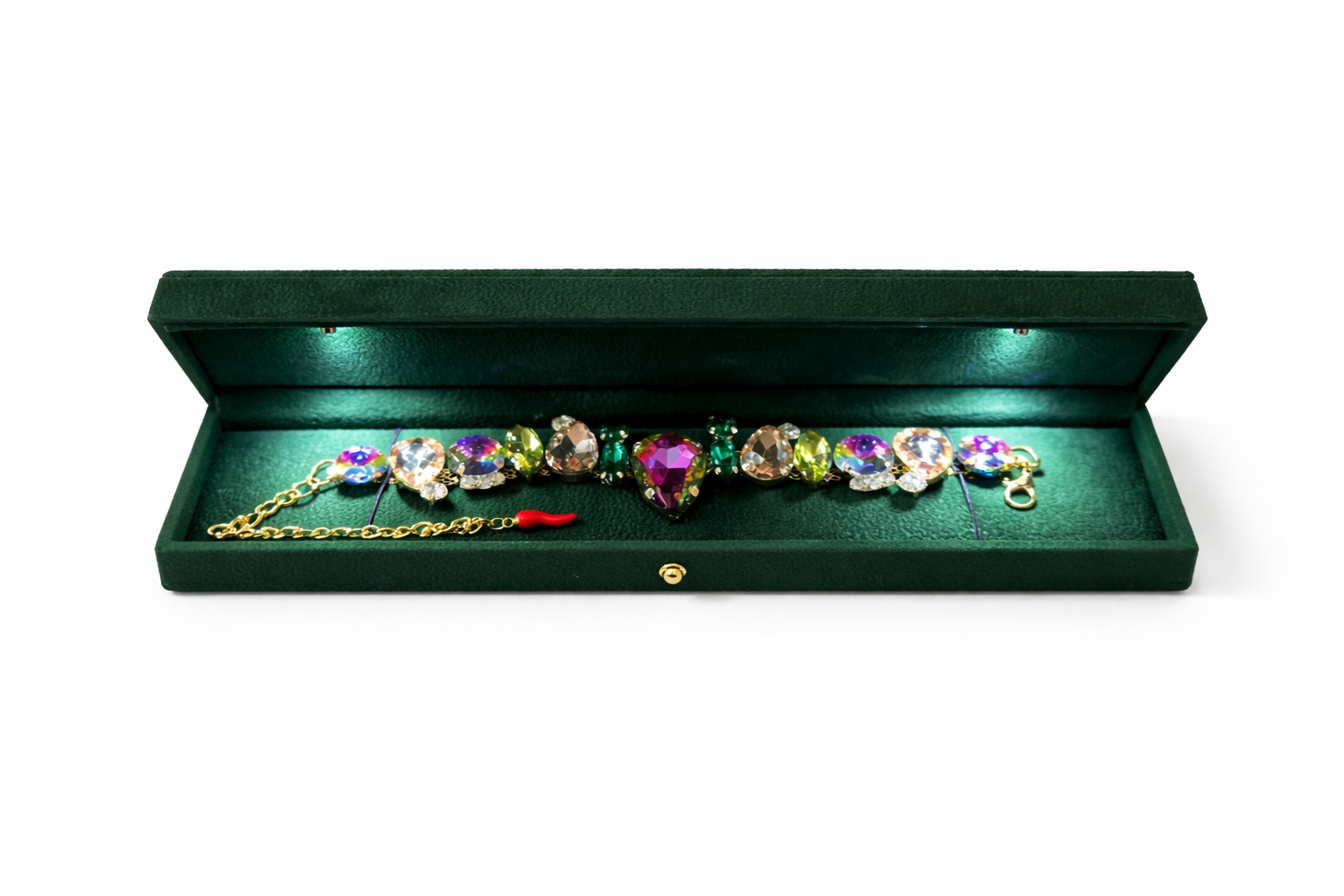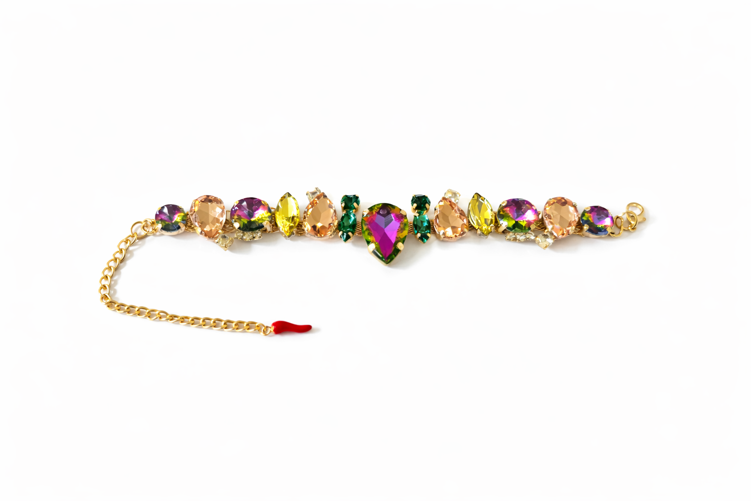 At its heart sits a dramatic centre crystal, framed by a symphony of stones that balance elegance with bold character. Finished with a gold-tone adjustable chain and a signature red chilli charm — a timeless Italian symbol of passion, protection, and good fortune — The Valentina is more than jewellery. It’s energy.