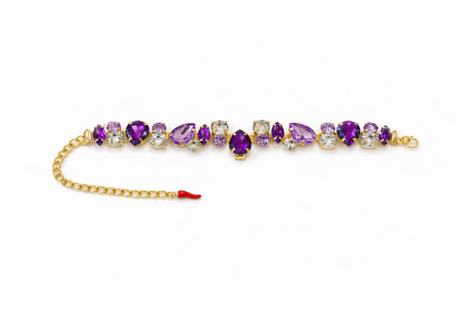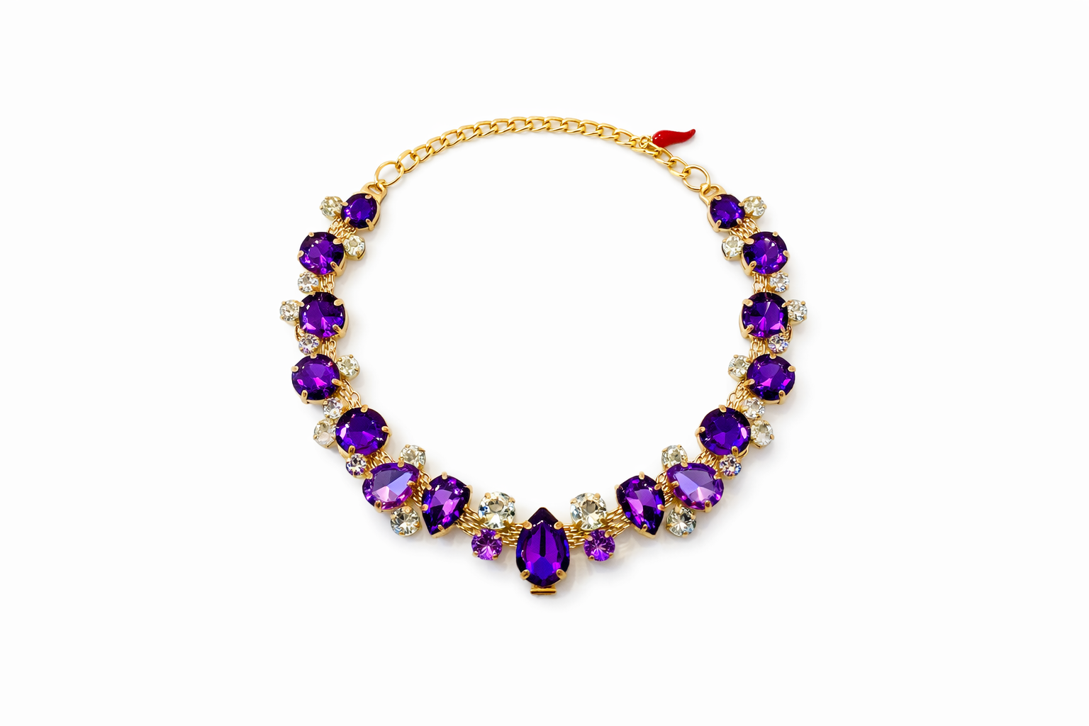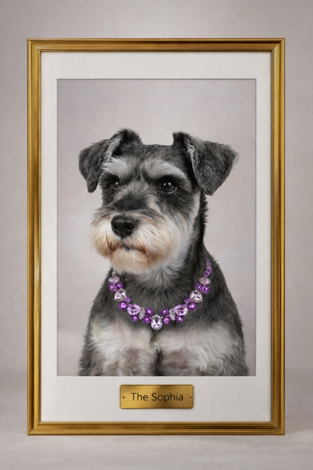 Graceful, refined, and effortlessly striking — The Sophia is a statement piece designed for dogs with undeniable presence. Featuring rich violet crystal stones set in a warm gold-tone chain, this collar balances classic elegance with modern glamour.
