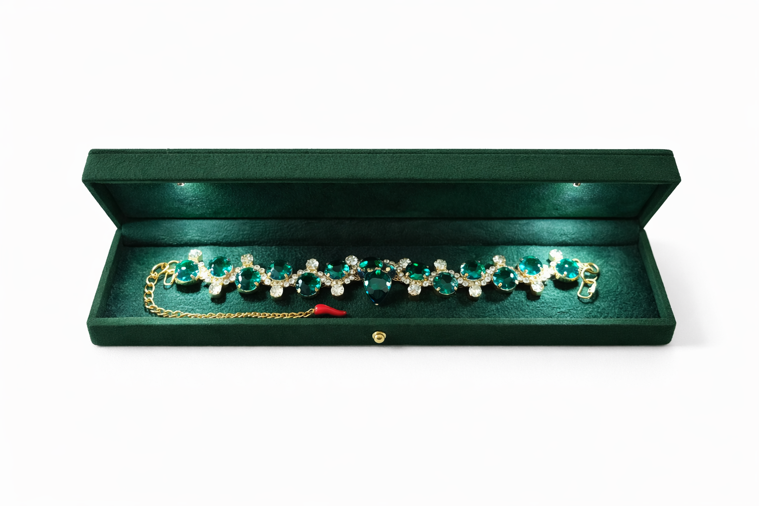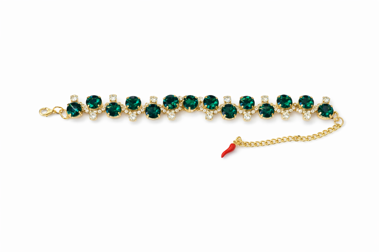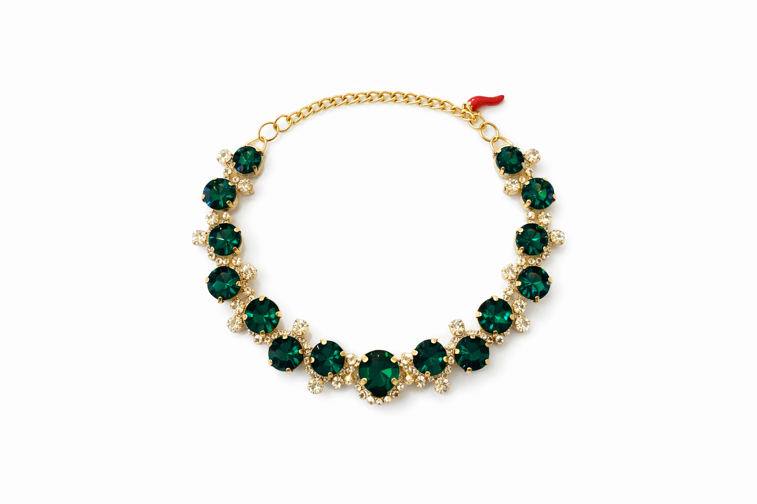 Each crystal is carefully set in a gold-tone finish, creating a balanced design that reflects light effortlessly from every angle. Finished with an adjustable chain and a signature red chilli charm — a traditional Italian symbol of protection, passion, and good fortune — The Celeste is designed to be worn with confidence and intention.