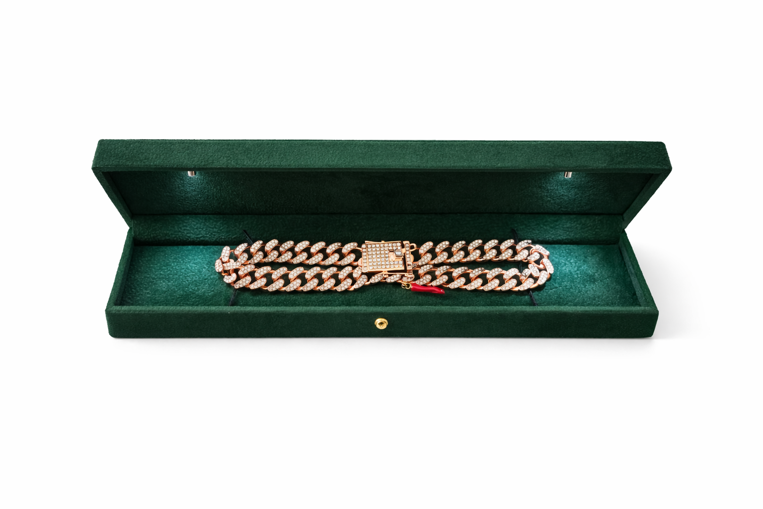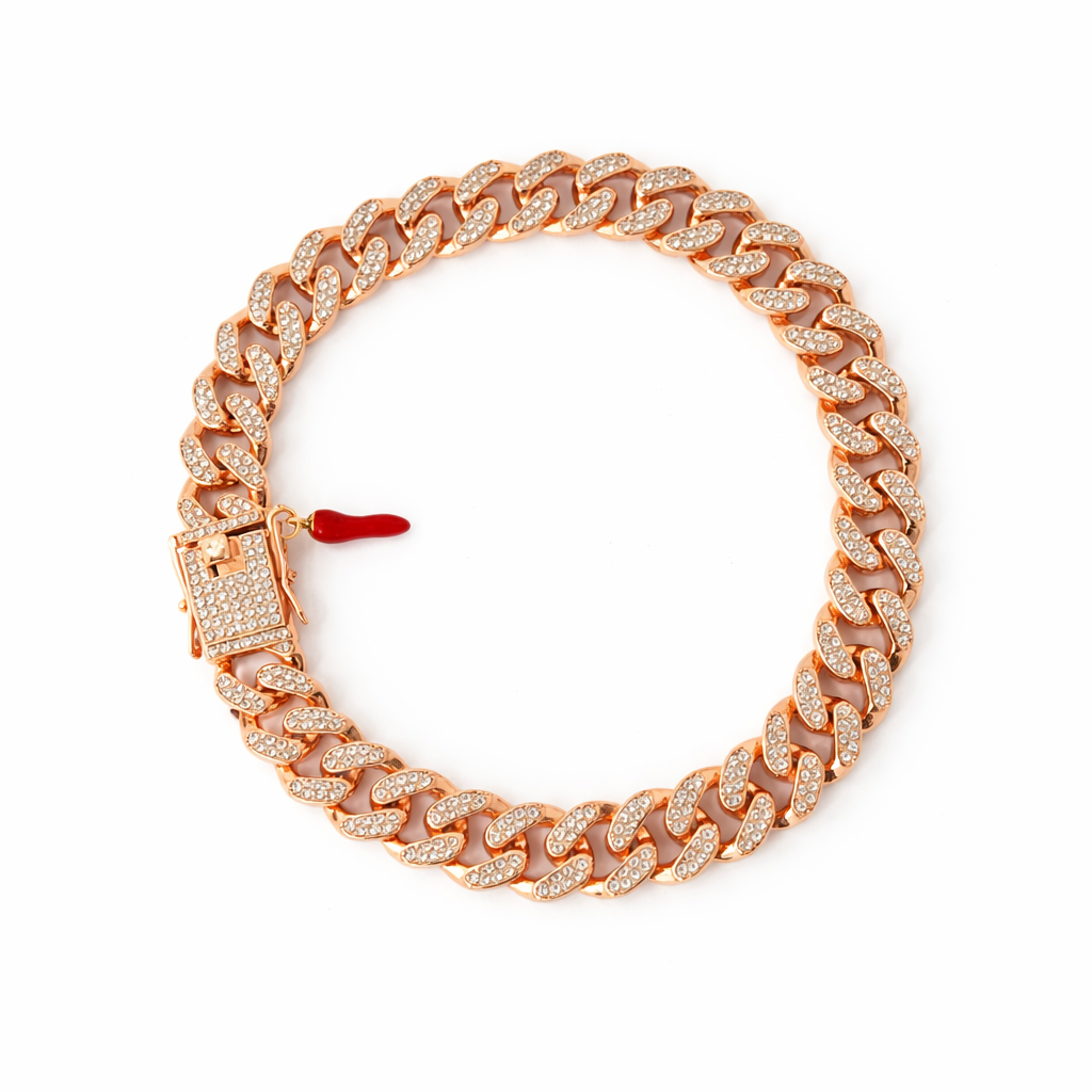 The Vittoria is a bold rose-gold Cuban-link necklace designed for those who wear confidence effortlessly. Each oversized link is encrusted with shimmering crystal accents, catching the light with every movement and delivering a look that is both powerful and refined.